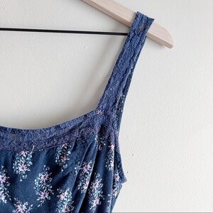Floral Romper by Abercrombie & Fitch, featuring a square neckline, lace trim, flat lace shoulder straps, lace tie back, cutout low back, romantic vintage-inspired floral print. Color: navy blue.