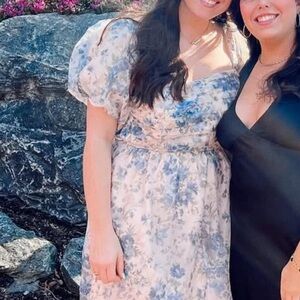 Elegant floral maxi dress by Abercrombie & Fitch. Features a delicate blue floral pattern on a cream background. Perfect for any occasion.