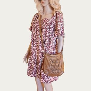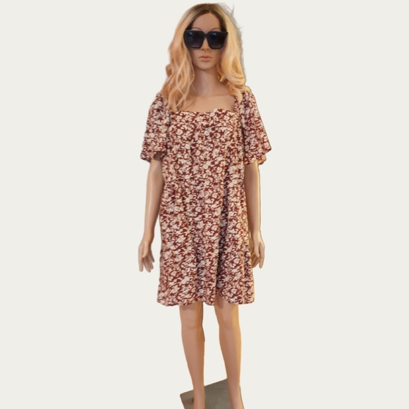 Chic floral mini dress. Features a square neckline. Short sleeves. Perfect for casual outings.