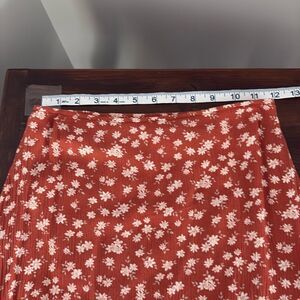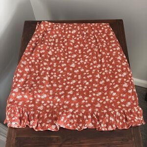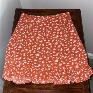 Excellent condition, Abercrombie & Fitch Floral Mini Skirt Size XS. Color orange with white flowers, side zipper, and 2 inch ruffle at bottom. Skirt is lined. 100% viscose - machine wash cold. See pictures for length and waist measurements.