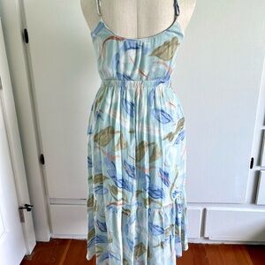 This gorgeous tropical floral print dress from Abercrombie & Fitch features a blend of blue and green hues, perfect for a spring picnic, the beach, or any occasion. This gathered, tiered dress is a light, soft, and flowy, and has an elasticated waist and delicate front button and tie details.