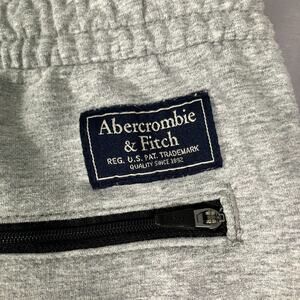 These A&F joggers feature a gray cotton-blend fabric with black and red striped trim down the sides, elastic waistband with drawstring, and ribbed cuffs. Comfortable and stylish casual wear.