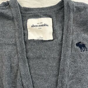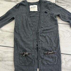 Cozy gray sweater with button front. Features two front pockets with bow details. Perfect for layering.