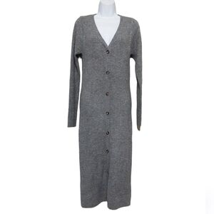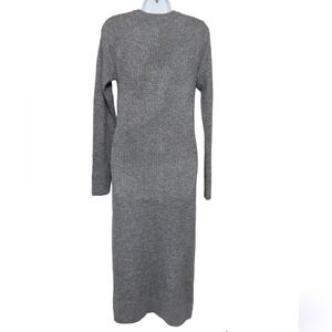 Stylish gray midi dress. Features button-down front. Long sleeves. Ribbed texture.
