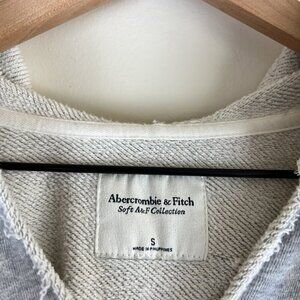 Abercrombie & Fitch Gray Terry Mixed Media V-Neck Cropped Hoodie. Pullover hooded sweatshirt. Soft a&f collection. Long sleeve. Beach coastal vibes. Cotton polyester blend. Size Small. Armpit to armpit: 21". Armpit to end of sleeve: 18.5". Length: 19.5". (812)
