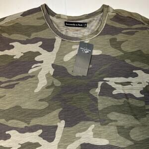 Elevate your casual style with this trendy camouflage print t-shirt from Abercrombie & Fitch. This short-sleeve tee features a classic crew neck and a convenient front chest pocket, adding a functional and stylish detail. The all-over green and brown camo pattern offers a versatile, earthy tone, perfect for pairing with jeans, shorts, or layering under a jacket. Made from a lightweight and soft fabric, it's designed for comfortable, everyday wear.