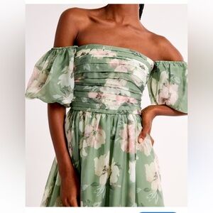 Elegant off-shoulder maxi dress. Features floral pattern. Flowy and stylish design.