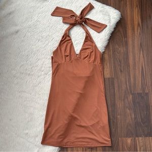 Super cute halter dress in a burnt orange/terracotta color. Strap detail in the back, ties at the neck. Stretchy, super comfortable fabric. Cowl draped back.