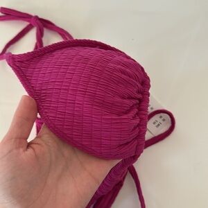 Classic string triangle bikini top in a trendy rib fabric, featuring adjustable tie straps and removable pads.