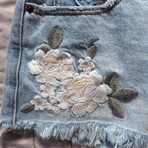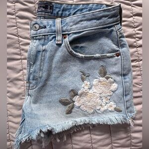 These Abercrombie & Fitch jean shorts feature a stylish embroidered design with a raw, frayed hem, perfect for a relaxed and casual look.