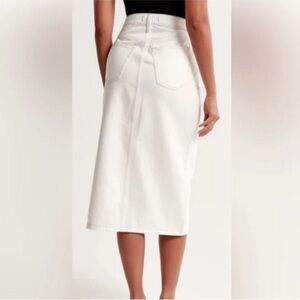 Refresh your wardrobe with this chic Abercrombie & Fitch High Rise Denim Skirt in crisp white. Designed with a flattering high-rise waist and a sleek midi length, this skirt is perfect for both casual and elevated looks. The front slit adds modern edge and movement while keeping the silhouette clean and versatile.