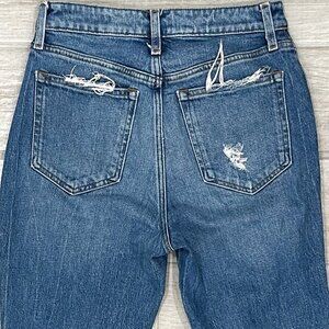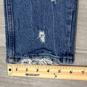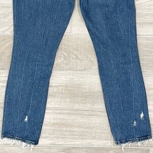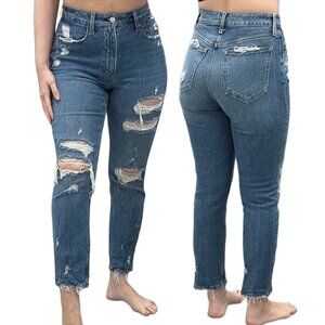 “Our Curve Love high rise mom jeans in a medium wash with extra distressed destroyed detailing throughout. This fit features a high rise, is form fitting at the waist with a slightly relaxed and tapered leg shape, which hits at ankle length. Our Curve Love styles add an additional 2” at the hip and thigh to allow room for your curves and eliminate waist gap.”