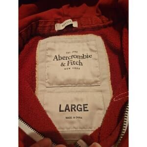 The Abercrombie & Fitch Hoodie in size Large is a stylish and vintage piece perfect for preppy kids. This red full-zip hoodie features a muscle fit style with a distressed look, giving it a unique and trendy appeal. Made from a blend of polyester and cotton, this hoodie is comfortable for activewear occasions. The long sleeves and zip closure make it easy to wear and perfect for cooler weather. This hoodie exudes a classic preppy vibe that is sure to make a statement.
