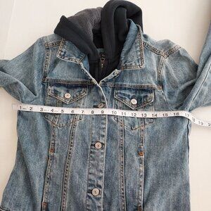 Size small Abercrombie & Fitch Hoodie Lined Denim Jacket. 100% cotton. Button down jacket with navy blue fleece hoodie inside. Zipper closure for hoodie. Pit to pit 17.5" Excellent pre-owned condition.