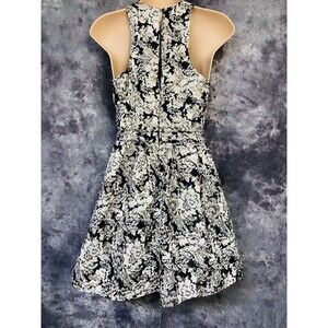 Excellent preowned condition with no flaws. Made of viscose/polyester blend in white/black/metallic silver floral ja jacquard print. Sleeveless, back zipper closure, fully lined, defined waist, full skirt. Above the knee length.