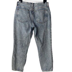 High rise mom jeans in an acid wash with slight distressing throughout.