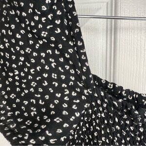 Stylish black maxi dress with white spots. Features a flattering fit and short sleeves.
