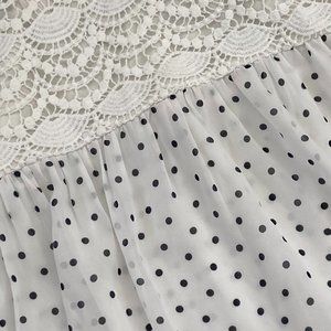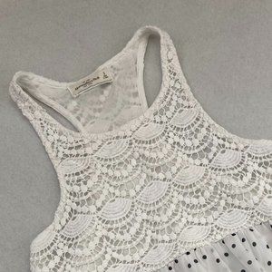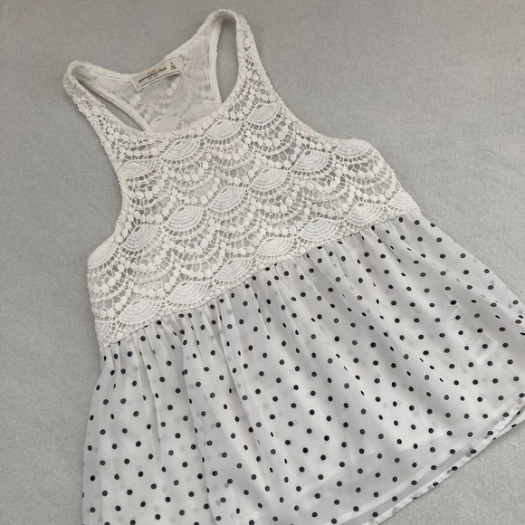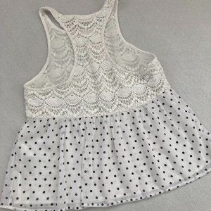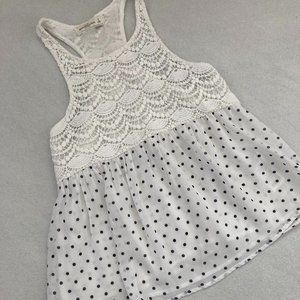 Abercrombie & Fitch Lace Detail white/black racer back sleeveless Top. Size S. This super cute racer back sleeveless top has lace detail on the bodice and white with black polka dots on the bottom. Fully lined, flattering cutaway/racer back detail. Material is cotton/polyester. Like new. From smoke/pet-free home. Please feel free to ask if you have any questions.