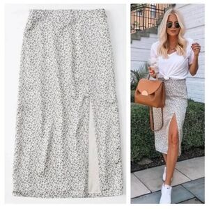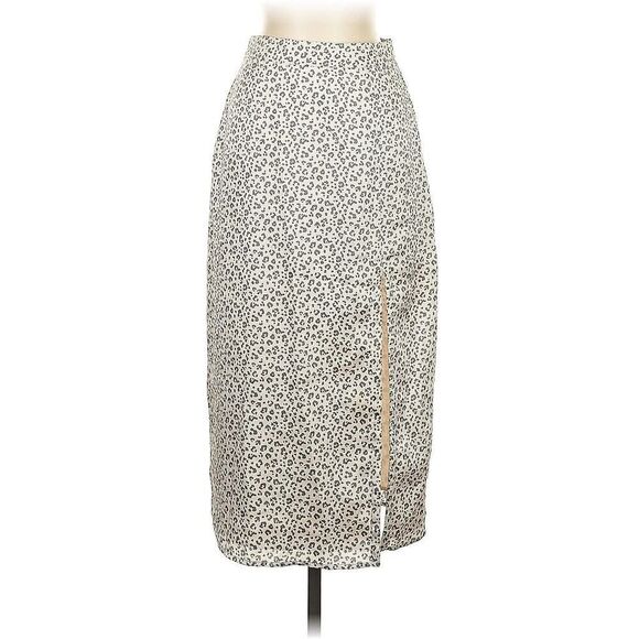 Abercrombie & Fitch Leopard Cheetah Animal Print Midi Skirt Color is a creamy gray, midi skirt with slit up the thigh, Skirt has a side zipper. Polyester.