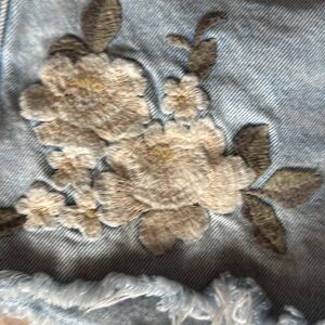 Chic light blue jean shorts with floral embroidery. Frayed hem adds a trendy touch.No stretch.