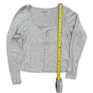 Cozy light gray button down. SUPER soft fabric. Ideal for layering. Like new. Please see pics for measurements and fabric details.