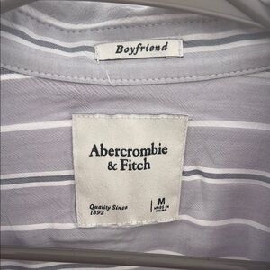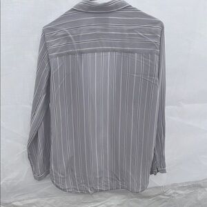 Chic light gray shirt with vertical stripes. Features a classic collar and dual front pockets.