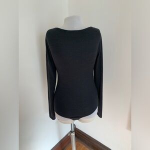 Super soft light weight sweater material, great verstile basic, twists in the front. Long sleeve, low neckline snaps at bottom. Lots of stretch. Is a dark navy blue looks almost black.