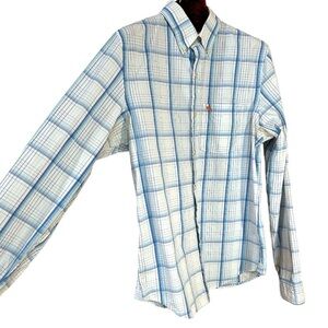 Abercrombie & Fitch Men's Button-Down Shirt Muscle Fit Size Large. Long sleeve 100% cotton shirt in a blue and white plaid check. Long sleeves with 2 button cuffs. Button front closure. Button down collar. One open pocket on front with embroidered A&F Moose logo.
