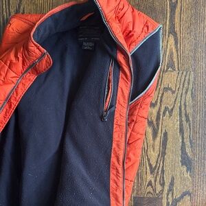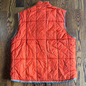 Bright orange vest with quilted design. Features zip closure and side pockets. Perfect for layering.