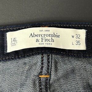This is a pair of Mid-Rise Abercrombie & Fitch jeans in a size 14L. Tag shows W 32 and L 35. These are The A&F Skinny and a dark blue wash.