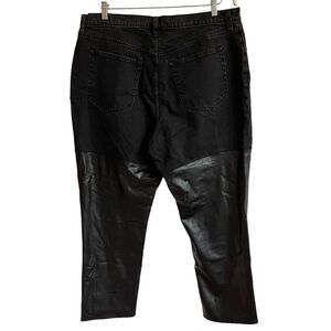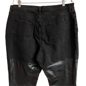 "On-trend 90's-style ultra high rise straight jeans with built-in stretch for superior comfort featuring our highest rise that sits at your natural waist and looks great with your shirt tucked or untucked. With refined details and a vintage feel from top to bottom, this style features a longer-length inseam, black wash, on-trend vegan leather mixed fabric detail and clean hem. Imported.