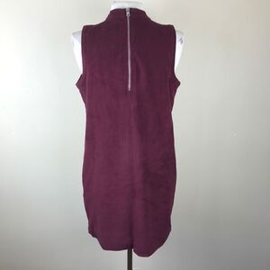 Really cute and perfectly in trend for the holidays. Deep maroon/burgundy color with a black stripe down the middle, back zip detail. Mock neck detail. Fully lined. Faux suede. Size medium. No flaws. Amazing condition. 18” pit to pit, 33” long. Y29🌳