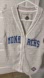 Sporty, vintage-inspired sleeveless button-up top from Abercrombie & Fitch. Features a heather gray base with bold blue “Monarchs” lettering across the front and a small embroidered patch near the hem. Designed with a V-neckline and full button front for a classic varsity/baseball jersey look. Soft, lightweight fabric makes it comfortable and easy to style.