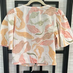 Stylish blouse with a tie-front design. Features a mix of pastel colors. Perfect for casual outings.