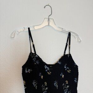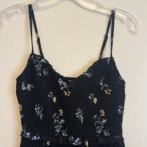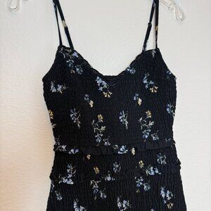 Feminine and flirty Abercrombie & Fitch mini dress featuring a black base with delicate blue and tan floral print. Smocked stretchy bodice for a flattering fit with adjustable spaghetti straps and a ruffled hemline for added detail. Perfect for casual outings, date nights, or summer events.
