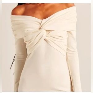 Abercrombie & Fitch long sleeve mini dress, size M Tall, color cream. Features an attractive off-the-shoulder design that knots in front and a fitted body. Fabric is high-quality and substantial, does not show underwear.