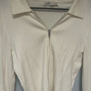 Elegant off-white/Ivory sweater with ribbed texture. Features a zip-up front and classic collar.