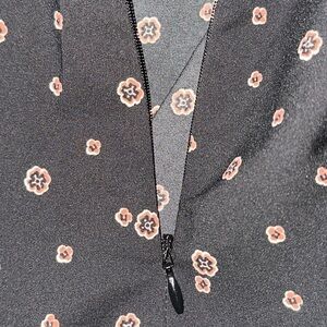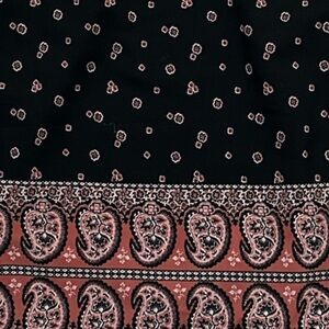 Black w/floral pattern and rust colored paisley print at hem and cuffs