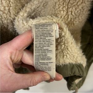Warm olive green jacket with plush sherpa lining. Ideal for chilly days. Has one button missing and doesn’t have hood lining (pictured)