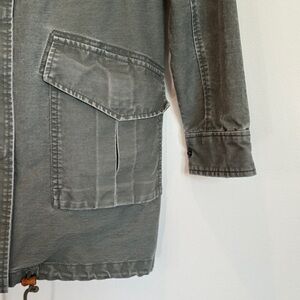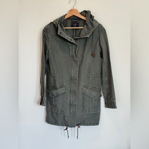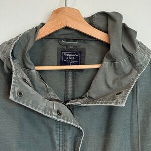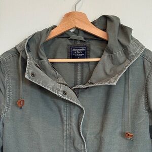 Chic olive utility jacket with hood. Features front pockets and button closure. Ideal for casual wear.