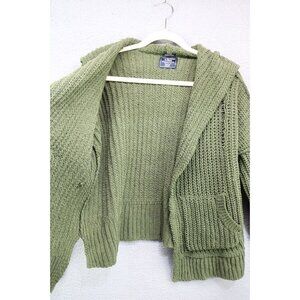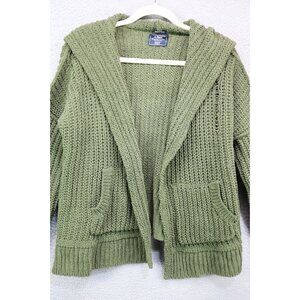 This is an Abercrombie & Fitch Open Chunky Knit Cardigan that is hooded. It is a size XXS/XS. The material tag has been removed. It has pockets and is very comfy. It is oversized. Laying flat, it measures: Armpit to armpit-25" and the length is 21.5". In good condition.