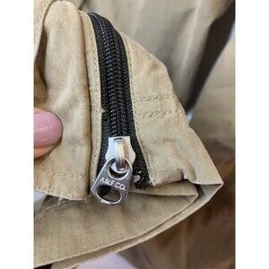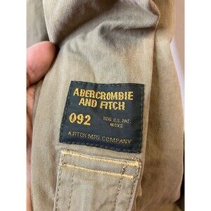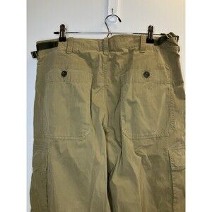 The product is a vintage pair of Abercrombie & Fitch men's pants in size L, featuring a khaki color and a relaxed fit with wide-leg style. Made from a blend of nylon and cotton fabric, these cargo pants have a high rise and flat front design with ankle zip accents and logo detailing. The pants have a cargo pocket style with multiple pockets for added functionality, perfect for casual or travel occasions. With a 30.5-inch inseam and 34-37 adjustable buckle waist size, these pants embody a grunge and 90s army-inspired theme.