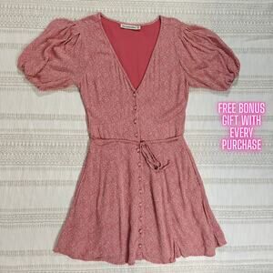 Flirty and feminine Abercrombie & Fitch mini dress in a soft pink floral print. Features a flattering deep V-neck, button-down front, puff sleeves, and an adjustable waist tie for a custom fit. Size XS. Used in good condition with no flaws. Lightweight and perfect for spring or summer brunch dates or casual outings.