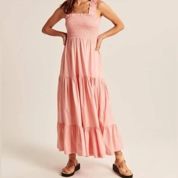 Beautiful Abercrombie & Fitch pink smocked bodice maxi dress. Features thick ruffle straps, tiered skirt, and flowy feminine silhouette. Excellent condition with no stains, rips, or flaws. Perfect for spring/summer, vacations, brunch, or cottagecore outfits.