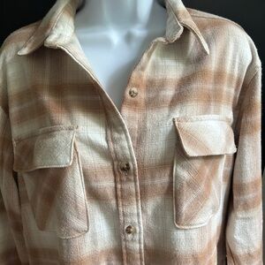 Chic oversized plaid shirt by Abercrombie & Fitch. Features a stylish blend of tan and white. Size small for oversized fit, however, I’m a L/XL and it fits wonderfully as a fitted shacket. The softest shacket you’ll own. Excellent condition from a smoke-free home.