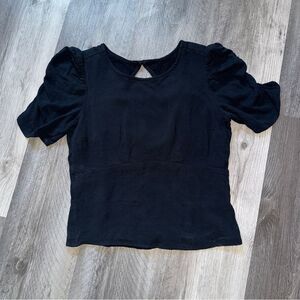 Perfectly preppy smocked top with open back and peasant sleeves from Abercrombie & Fitch. Midnight navy {almost black}. Size small. Smocked back creates comfortable stretch to fit your body. Open back with keyhole closure at the neck. Please see photo section for approximate flat measurements + my model stats for fit reference. Material: 100% viscose.