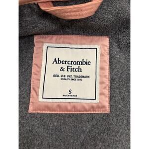 This is a stylish jacket from Abercrombie & Fitch, featuring a soft pink color and snal button closure. It is designed for casual wear and provides a comfortable fit. It is a size small and in good used condition. There is a loose stitch on each elbow. Please see all pictures.