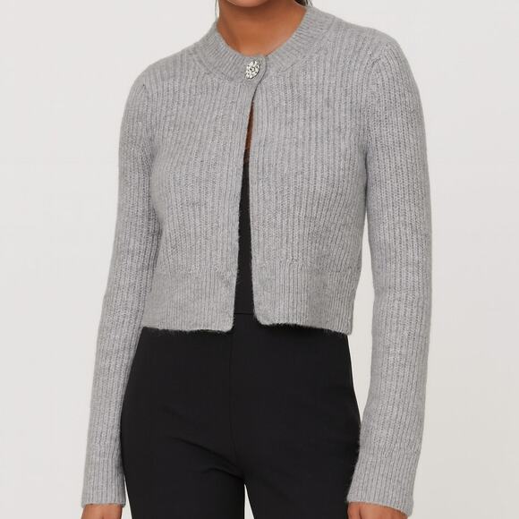 Details: Ribbed knit texture, jeweled button closure, long sleeves, soft wool blend