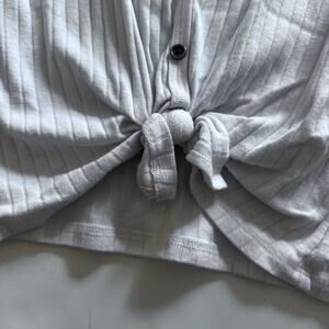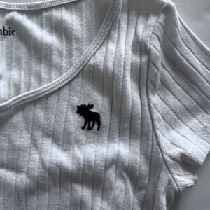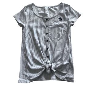 This is an Abercrombie & Fitch ribbed top in white, perfect for teen girls! It features short sleeves, a ribbed texture, and a button-front design. The hem is tied for a stylish touch.