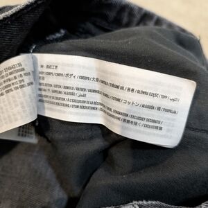 Charcoal denim pants with a loose fit. Features a classic button closure.